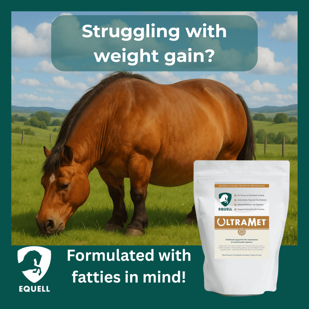 Horses on restricted forage or grazing often miss the variety of plant fibres they’d find naturally - this can negatively effect the hindgut microbiome and make weight management harder. UltraMet is built for these situations: it supports normal metabolic function, helps maintain comfortable, healthy laminae and backs the body’s healthy inflammatory response through carefully selected vitamins, minerals and amino acids.
